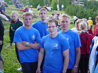 2004 Kajaanin SM-viestien hopeajoukkueen poseeraus. (vas.) Ville Vakkuri, (takana) Janne Kovasin, (edessä) Mikko Häkkilä ja (oik.) minä itse.